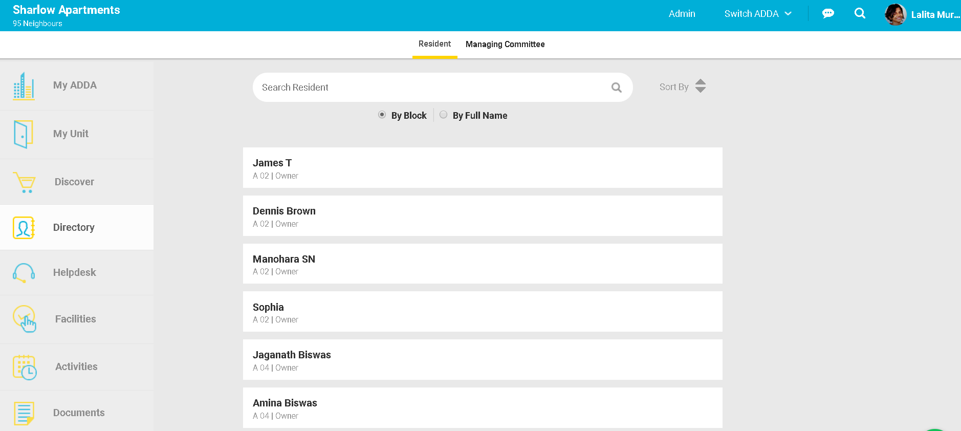 MyADDA provides you two ways to search for any resident details i.e By Block or By Full Name.